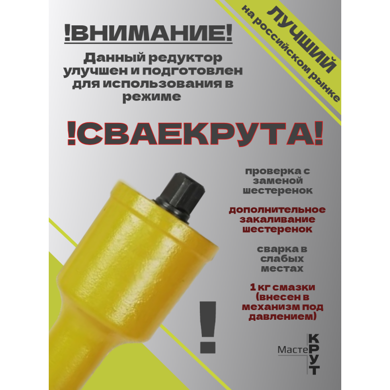 Обращаем Ваше внимание на то, что после установки данного редуктора в механизм сваекрута на базе силовой техники, гарантия производителя снимается, так как инструмент эксплуатируется не по назначению! В комплекте с данным редуктором ЗАПРЕЩЕНО использование ударного инструмента (гайковёртов, перфораторов и т.д.)!