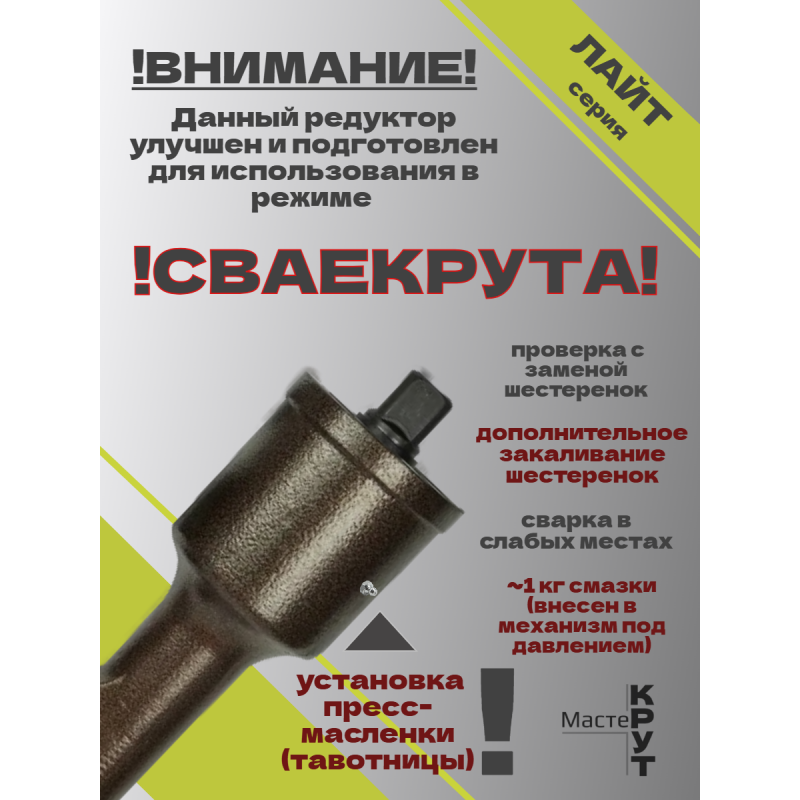 Комплект СВАЕКРУТА "ГОТОВ К РАБОТЕ 5.1" - новый на рынке инструмент для погружения металлических свай в грунт. Данный комплект содержит все детали, которые необходимы для сборки оборудования, а именно: 1. 1 головка-насадка толщиной 5мм для свай 57/89, 1 головка-насадка толщиной 5мм для свай 76/108, 1 палец для фиксации головок, 1 корпус, 1 переходник КМ3, 1 рычаг-усилитель, подготовленный усиленный редуктор 7500Н/м, а также силовая техника - дрель электрическая Rebir мощностью 2кВт 1 скоростная (до 108 сваи). Изделия ручной работы выполнены на собственном производстве с применением лучших станков, новейших технологий и качественных расходных материалов. Данный комплект для сборки СВАЕКРУТА подойдет для покупателей, которые не первый год в стройке, которые адекватно оценивают условия, в которых работает СВАЕКРУТ, и, следовательно, понимают, что реальная стройка "убивает" красоту и новизну инструментов. Как профессионал своего дела считаю, что нет смысла переплачивать за лишнюю работу по пескострую металла, порошковой окраске и т.д., если после первого объекта железо станет побитым, поцарапанным или, даже, помятым! Сделано от российского мастера для российских и новых российских специалистов с пониманием всего процесса работы и применением проверенных временем технологий. Не любуйтесь на красивые картинки, а работайте с уверенностью и комфортом!