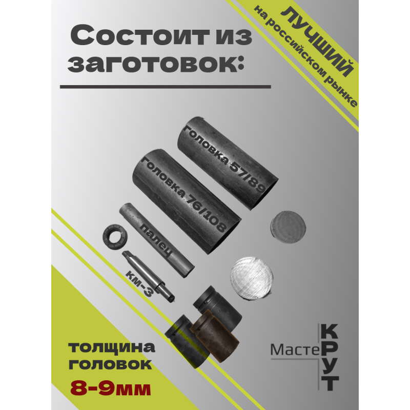 Комплект деталей для изготовления СВАЕКРУТА "Я - МАСТЕР" предназначен для тех пользователей, кто уверен в себе и точно знает, что сможет сделать лучше. Набор содержит все необходимые детали для изготовления всех комплектующих: головок-насадок на 57/89 и 76/108 сваи толщиной 8-9мм, фиксирующего пальца 30мм, корпуса, рычага-усилителя и переходника КМ-3. В комплекте идет краткая инструкция по изготовлению деталей. Если Вы сделаете все правильно, то в итоге получите наш комплект "ЖЕЛЕЗО - 9" с большой выгодой!